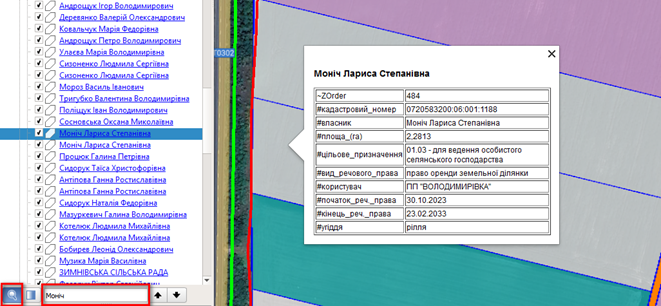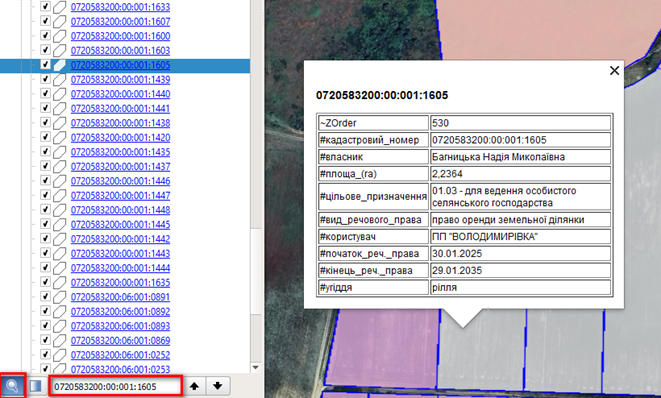 1. назва ФГ (кад. номер) – назва в дужках означає що можна здійснювати пошук земельних ділянок за кадастровим номером (у форматі ХХХХХХХХХХ:ХХ:ХХХ:ХХХХ) який потрібно вписати у рядок пошуку. Далі вибрати цю ділянку із списку двічі натиснувши по ній, програма покаже вибрану ділянку на карті;
