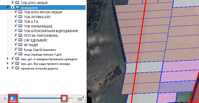3. назва ФГ (оренда) – у файлі містяться дані, що представлені у вигляді тематичної карти про терміни та вид речового права користування земельними ділянками, якими користується ваше господарство, а також ділянки ваших конкурентів;